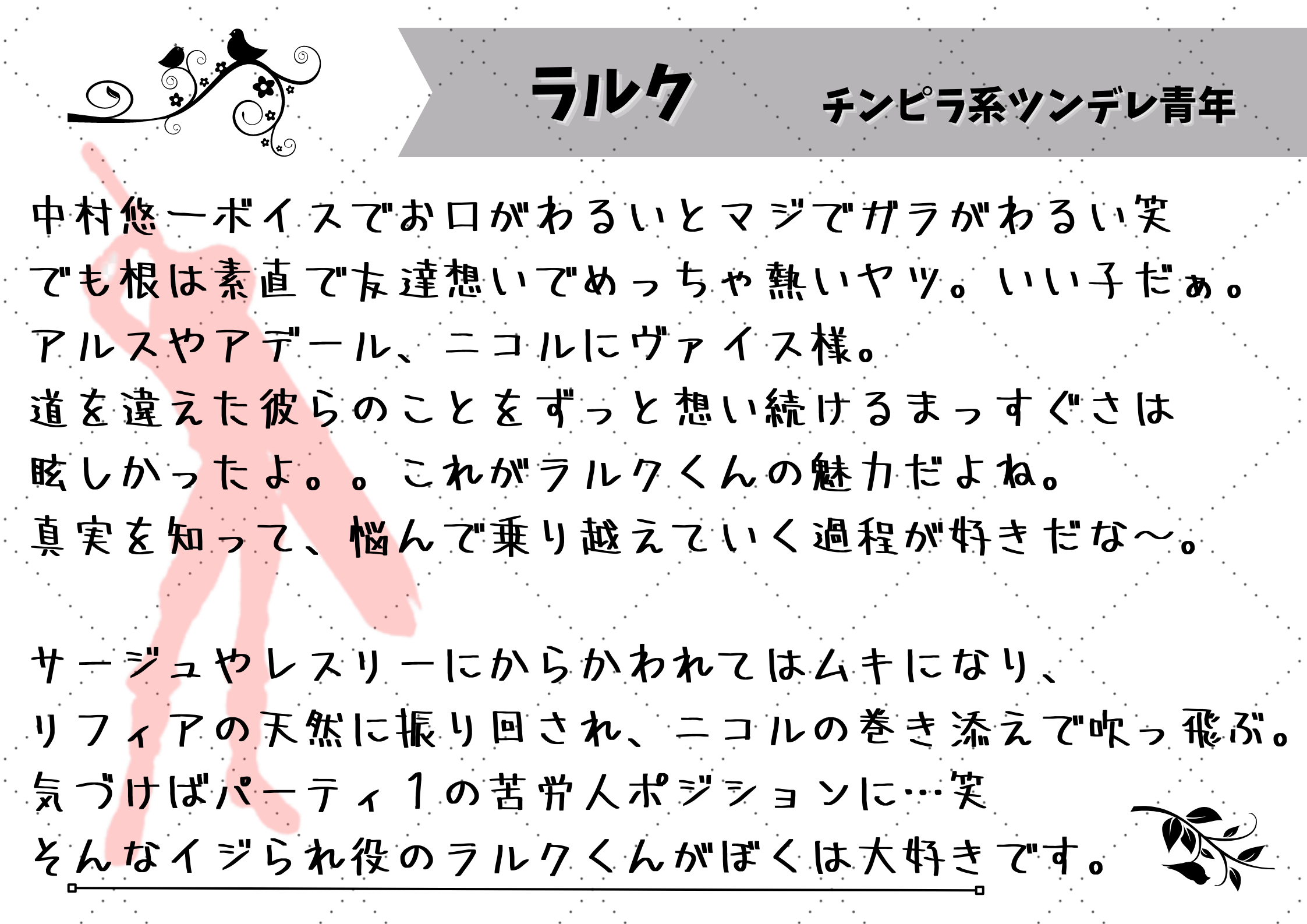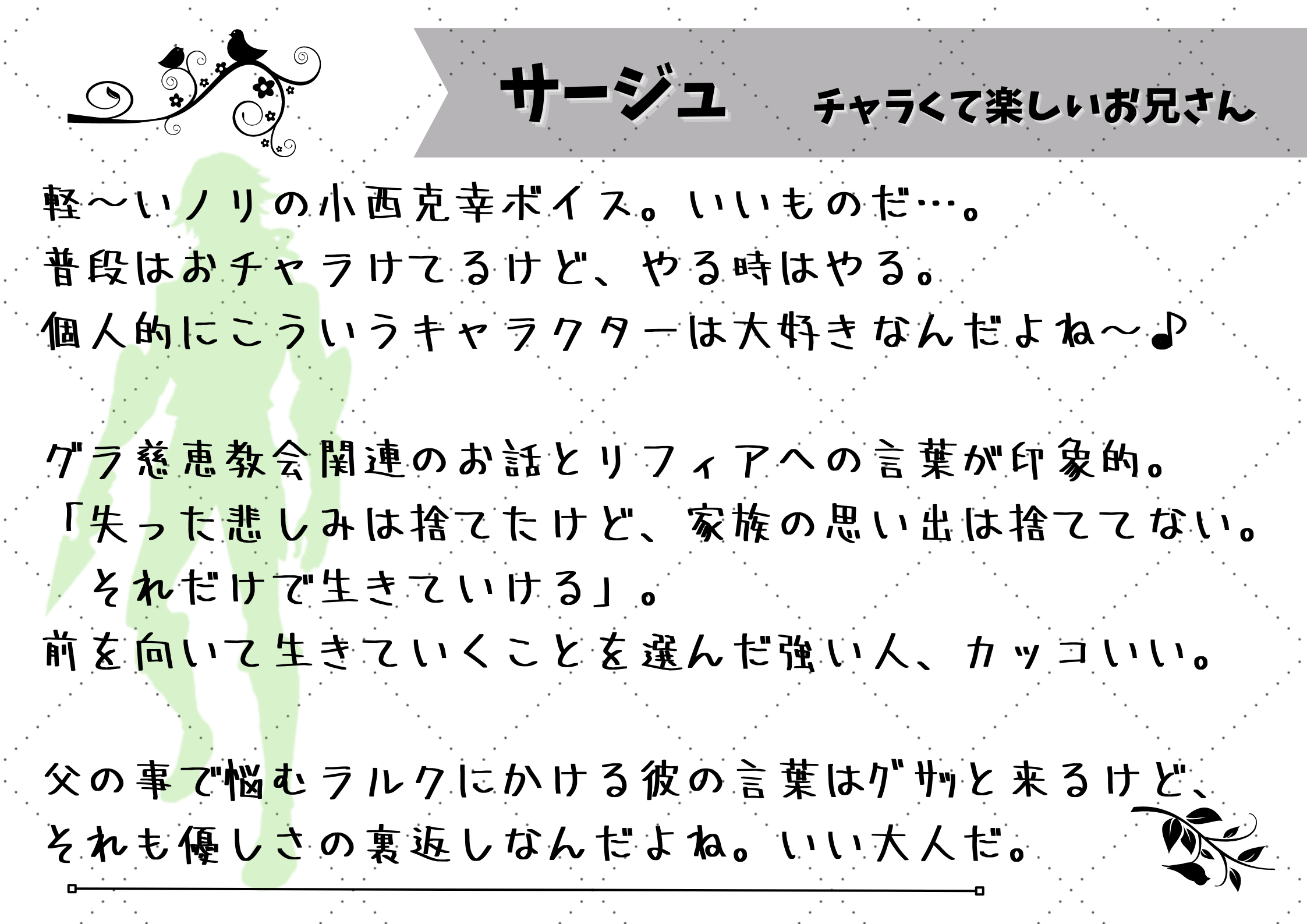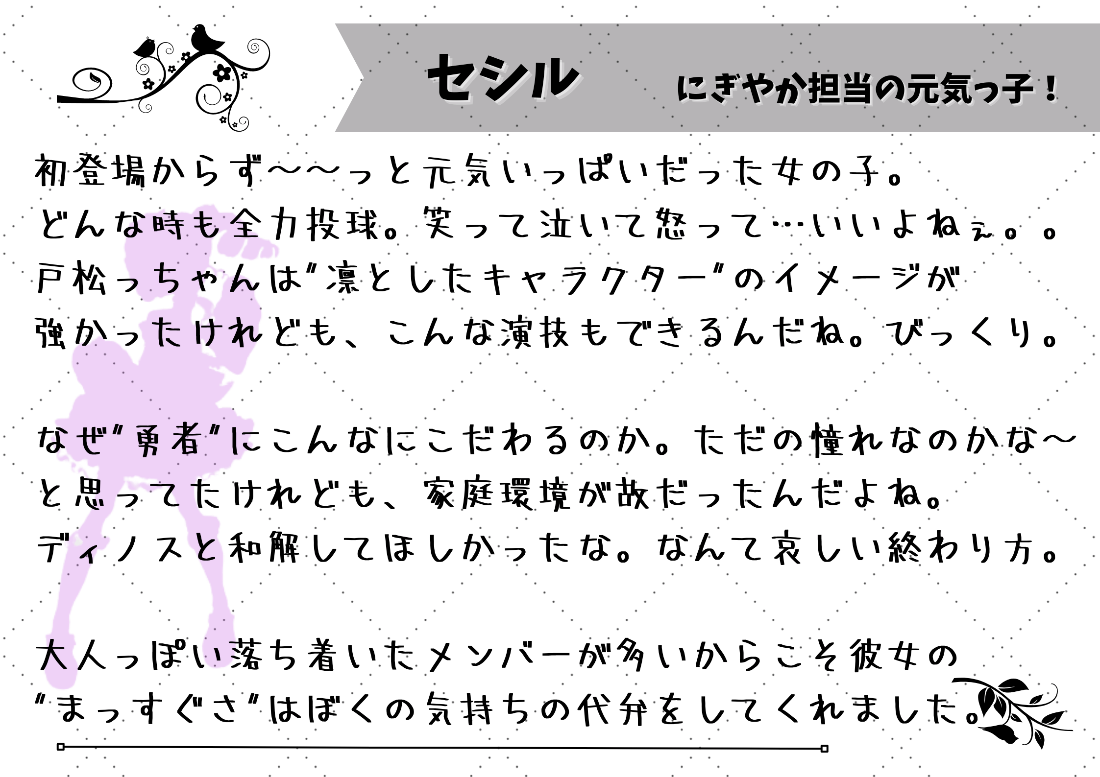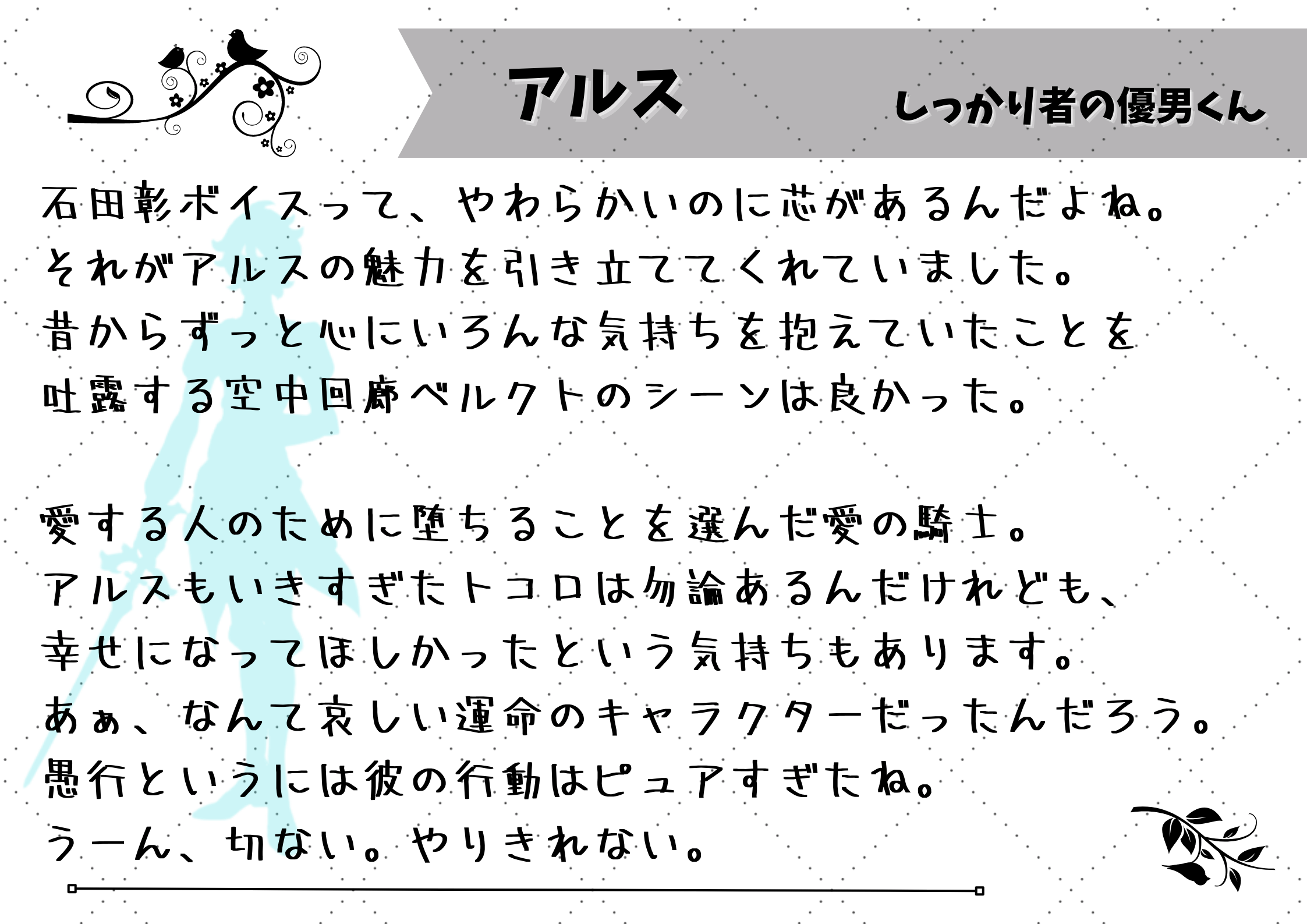 登場キャラクターの感想や好きなイベントについて。好きな舞台やBGMなどテーマはなんでもあり!